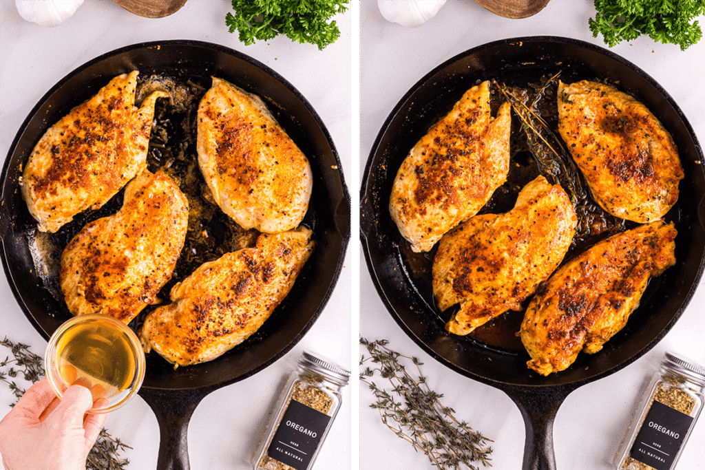 After searing, reduce the heat, add a tablespoon of butter, crushed garlic cloves, and herbs. Spoon the melted butter over the chicken repeatedly for 1–2 minutes.
